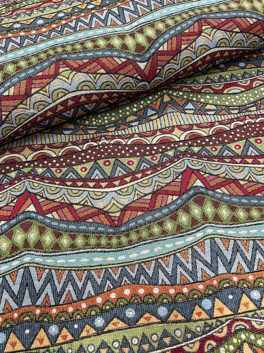 Високоякісна гобеленова тканина Cantina з геометричним малюнком. Вироблено в Іспанії. Таку тканину можна використати для виготовлення подушки, скатертини, верхнього одягу чи іншого декору. Ширина тканини 280 см. Також можна придбати таку ж тканину в ширині 140 см.