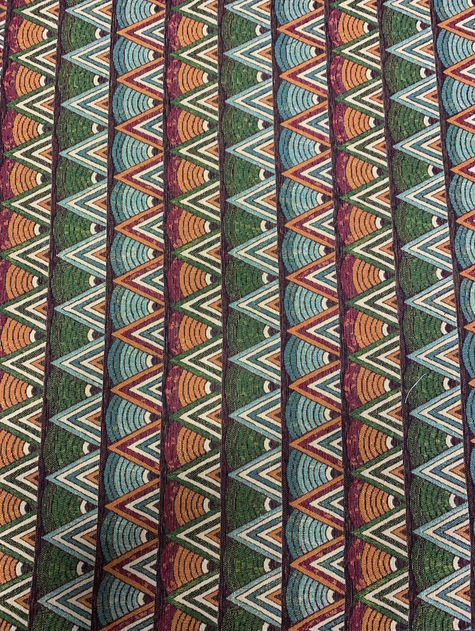 Високоякісна гобеленова тканина з геометричним малюнком. Вироблено в Іспанії. Таку тканину можна використати для виготовлення подушки, скатертини, верхнього одягу чи іншого декору. Ширина тканини 140 см.