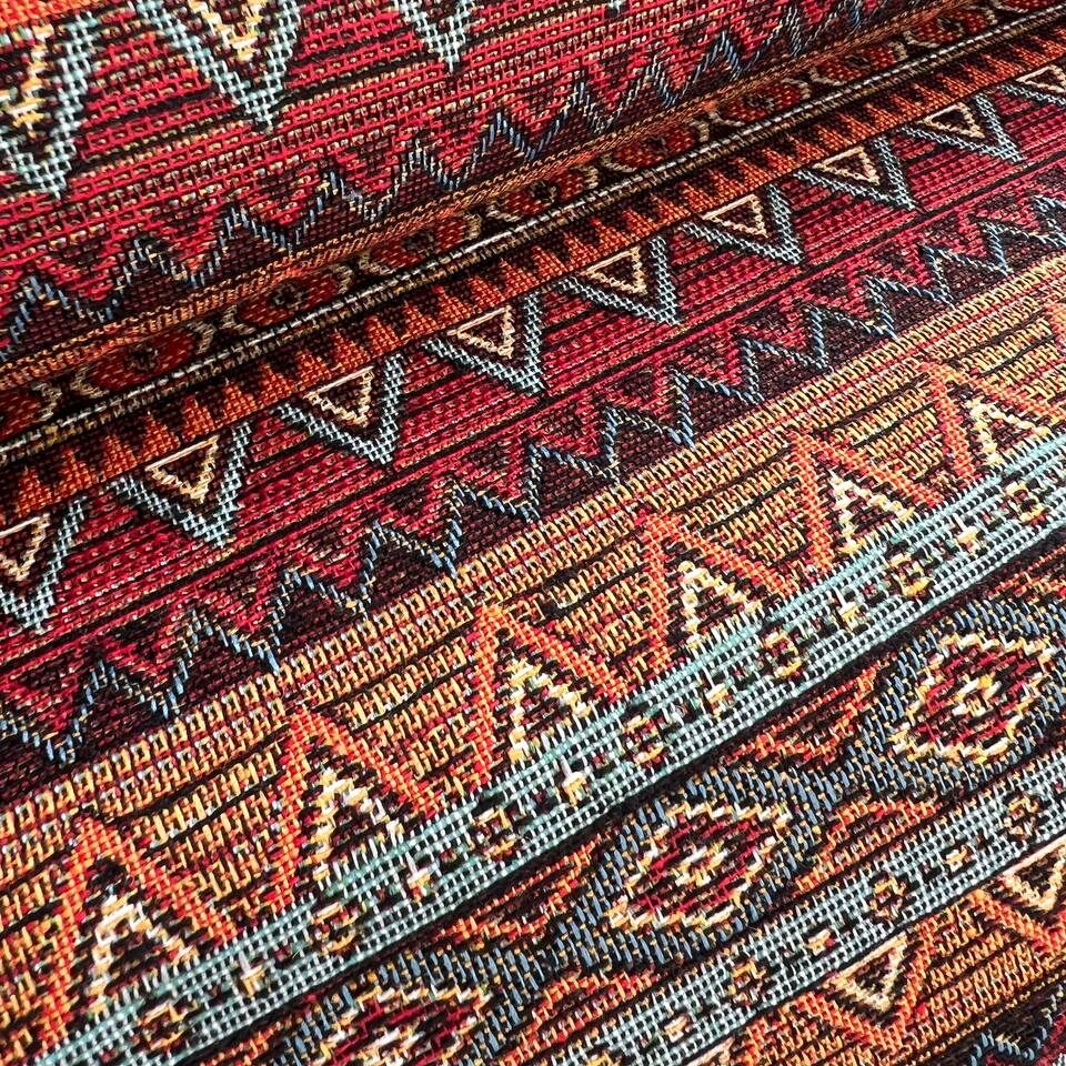 Високоякісна гобеленова тканина з геометричним малюнком. Вироблено в Іспанії. Таку тканину можна використати для виготовлення подушки, скатертини, верхнього одягу чи іншого декору. Ширина тканини 280 см.