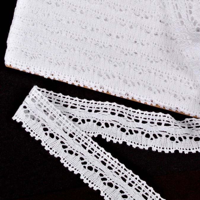 Якісне мереживо вироблене на коклюшних машинах з високоякісної бавовняної мерсеризованої пряжі. Це мереживо підходить для декорування одягу, костюмів, пошиття аксесуарів для дому, текстильних аплікацій, печворку, креативних витворів, скрапбукінгу, колажів, святкових композицій та флористики. Купити онлайн. Роздріб та гурт. Виробництво — Чехія.