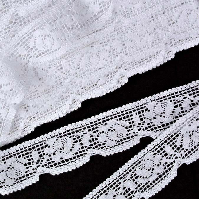 Якісне мереживо вироблене на коклюшних машинах з високоякісної бавовняної мерсеризованої пряжі. Це мереживо підходить для декорування одягу, костюмів, пошиття аксесуарів для дому, текстильних аплікацій, печворку, креативних витворів, скрапбукінгу, колажів, святкових композицій та флористики.